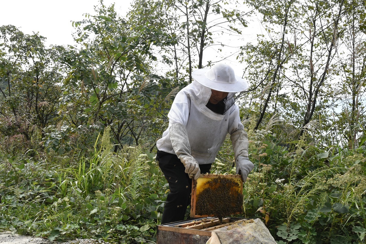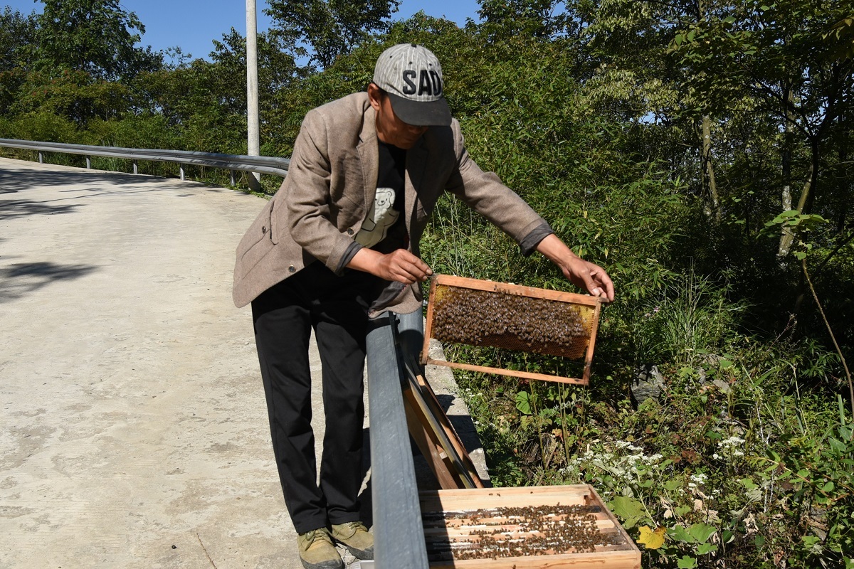 金秋九月,蜂蜜飘香。遵义市桐梓县羊磴镇高山村公路沿线摆满了蜂箱,一个个错落有致地排列,成群结队的小蜜蜂进进出出,空气中弥漫着浓浓的蜂蜜香味。